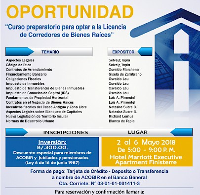 Publicado el 25/05/20194to. Curso Preparatorio para optar por la Licencia de Corredor de Bienes Raíces - 2018Del 2 al 6 de julio del 2018