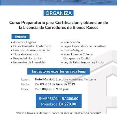 Publicado el 10/04/20193er. Curso Preparatorio para optar por la Licencia de Corredor de Bienes Raíces - 2019Del 3 al 7 de junio del 2019.