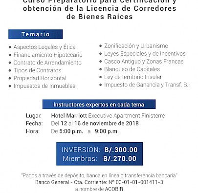 Publicado el 21/09/20186to. Curso Preparatorio para optar por la Licencia de Corredor de Bienes Raíces - 2018Del 12 al 16 de noviembre del 2018.