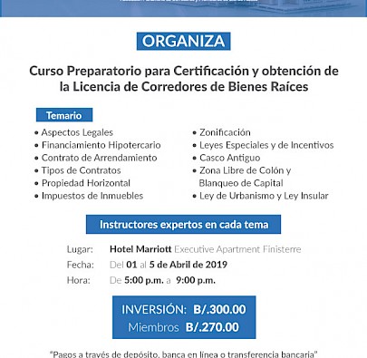 Publicado el 04/12/20181er. Curso Preparatorio para optar por la Licencia de Corredor de Bienes Raíces - 2019Semana del 11 al 15 de febrero del 2019.