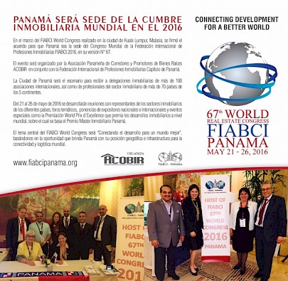 Publicado el 15/06/2016Panamá será Sede de la Cumbre Inmobiliaria Mundial FIABCI 2016Eventos especiales como la Premiación World Prix D´Excellence que premia los desarrollos inmobiliarios a nivel mundial.